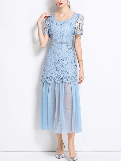 Beautiful Lace Mesh Short Sleeve High Waist Blue Dress - Ships in 24 Hrs